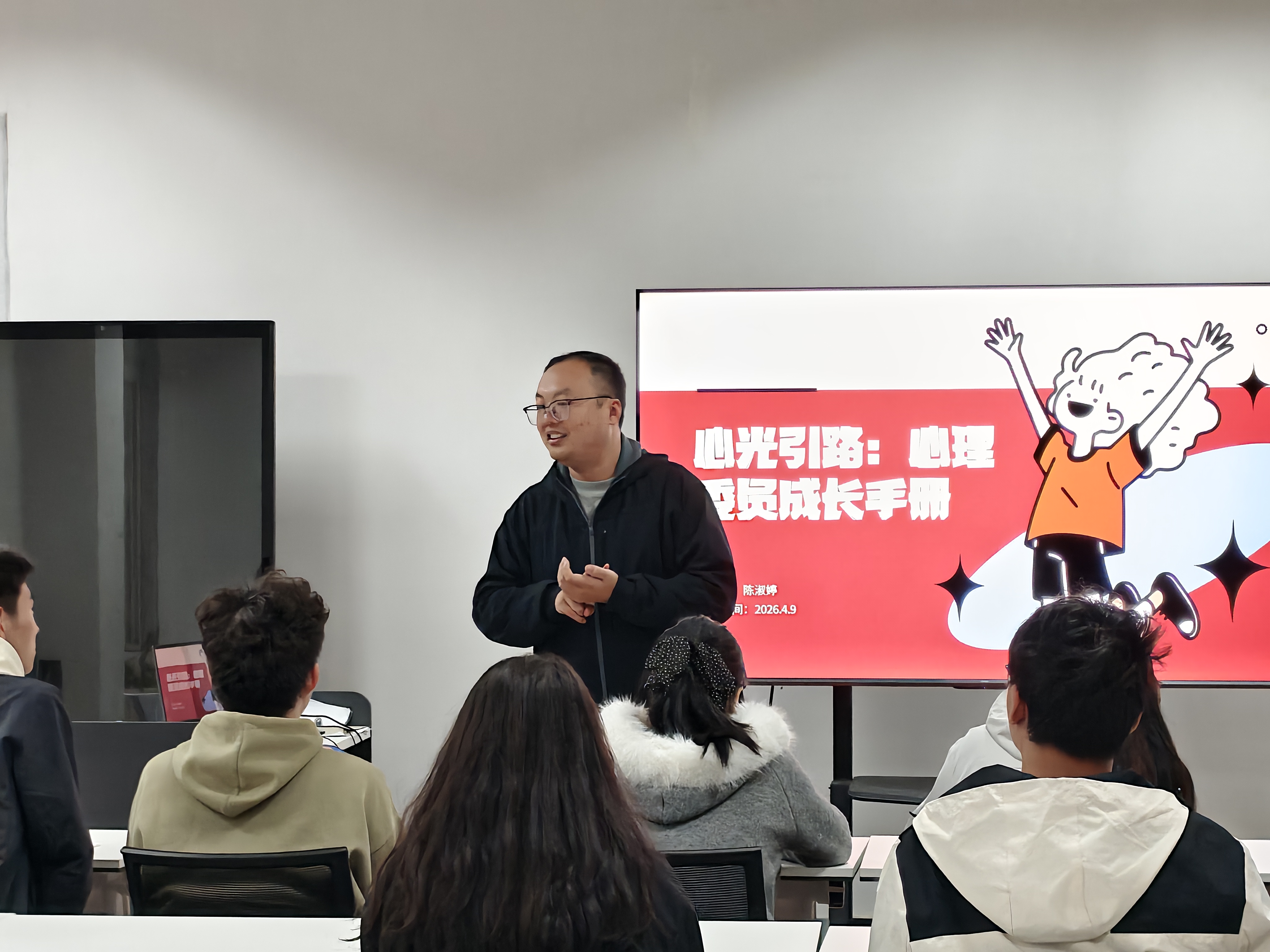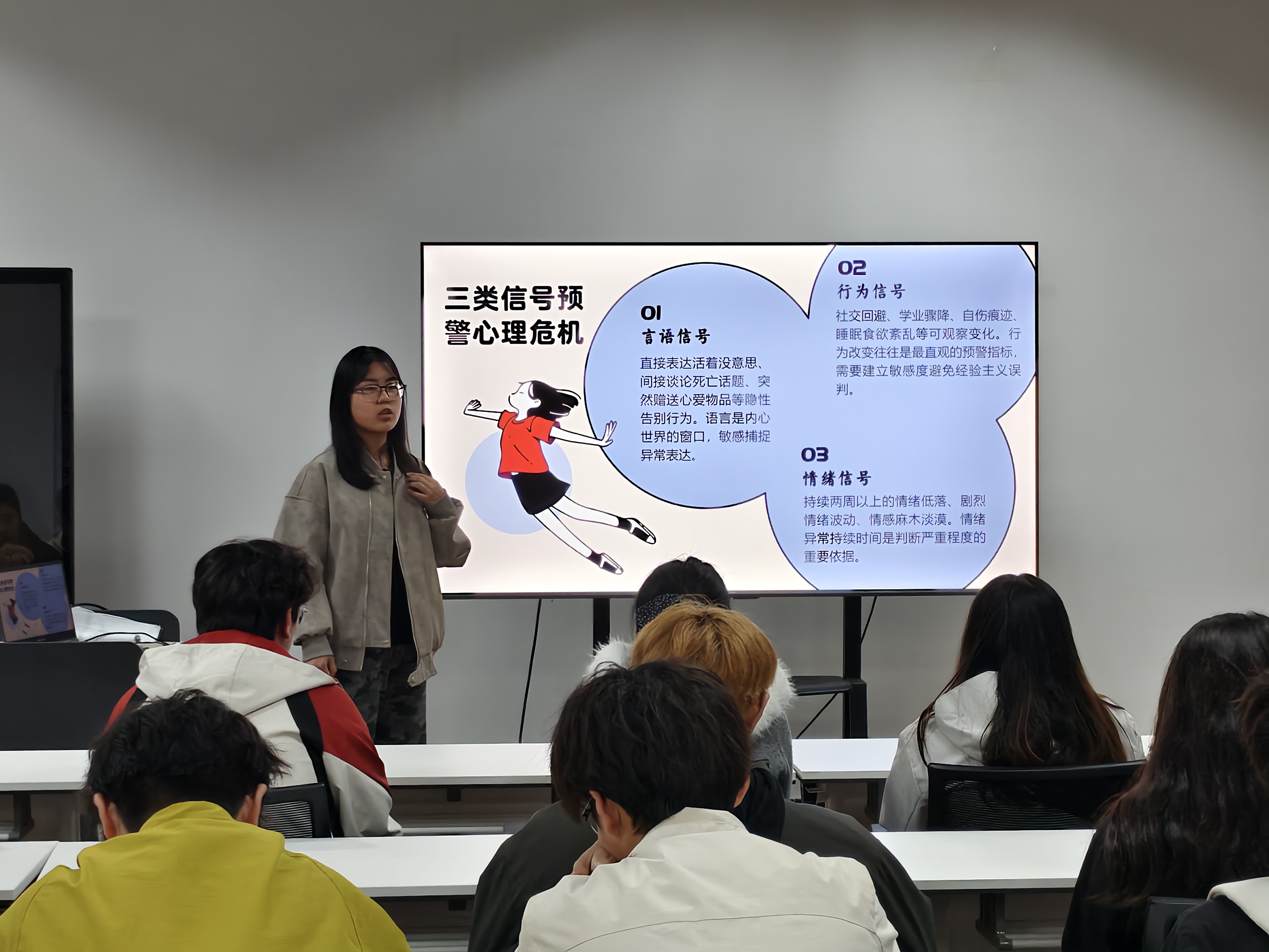 本次培训以“心光引路:心理委员成长手册”为主题,特别邀请心理委员代表、人工智能243班陈淑婷同学担任主讲人。主讲过程中,陈淑婷结合班级心理工作实际案例,详细拆解了心理危机在言语表达、行为表现、情绪状态三个层面的典型预警信号,系统讲解了危机识别的实用技巧。