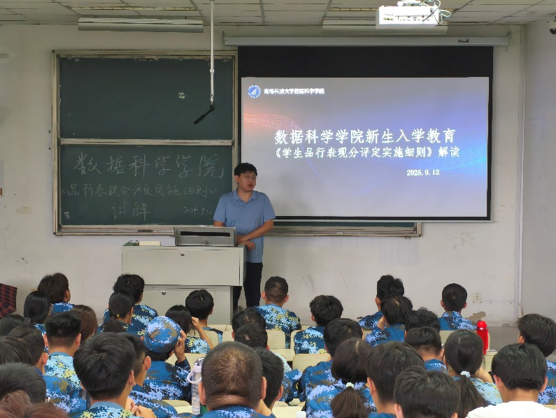 为了帮助新生快速融入大学生活,明确德育评价要求,为大学阶段成长奠定坚实基础,9 月 12 日,青岛科技大学数据科学学院在弘毅楼 E 区 202 教室举办新生入学教育活动,学院团委副书记兼学工办副主任姜国华担任主讲。
