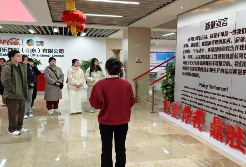 在企业讲解员的专业引导下,学院师生先后走进企业文化展示区、全自动化生产车间与多功能观影区。展示区里,老照片与实物展品勾勒出可口可乐百年品牌脉络,同学们认真聆听讲解,深入领悟品质至上核心理念,对企业品牌建设与文化传承形成立体认知。生产车间内,原料调配至装箱入库的全流程清晰呈现,全球领先的生产技术与环保设备,同学们直观感受科技赋能产业升级的动力,深刻领悟可持续发展理念。观影环节中,同学们了解到企业公益实践成果,也体会到企业的社会责任担当。