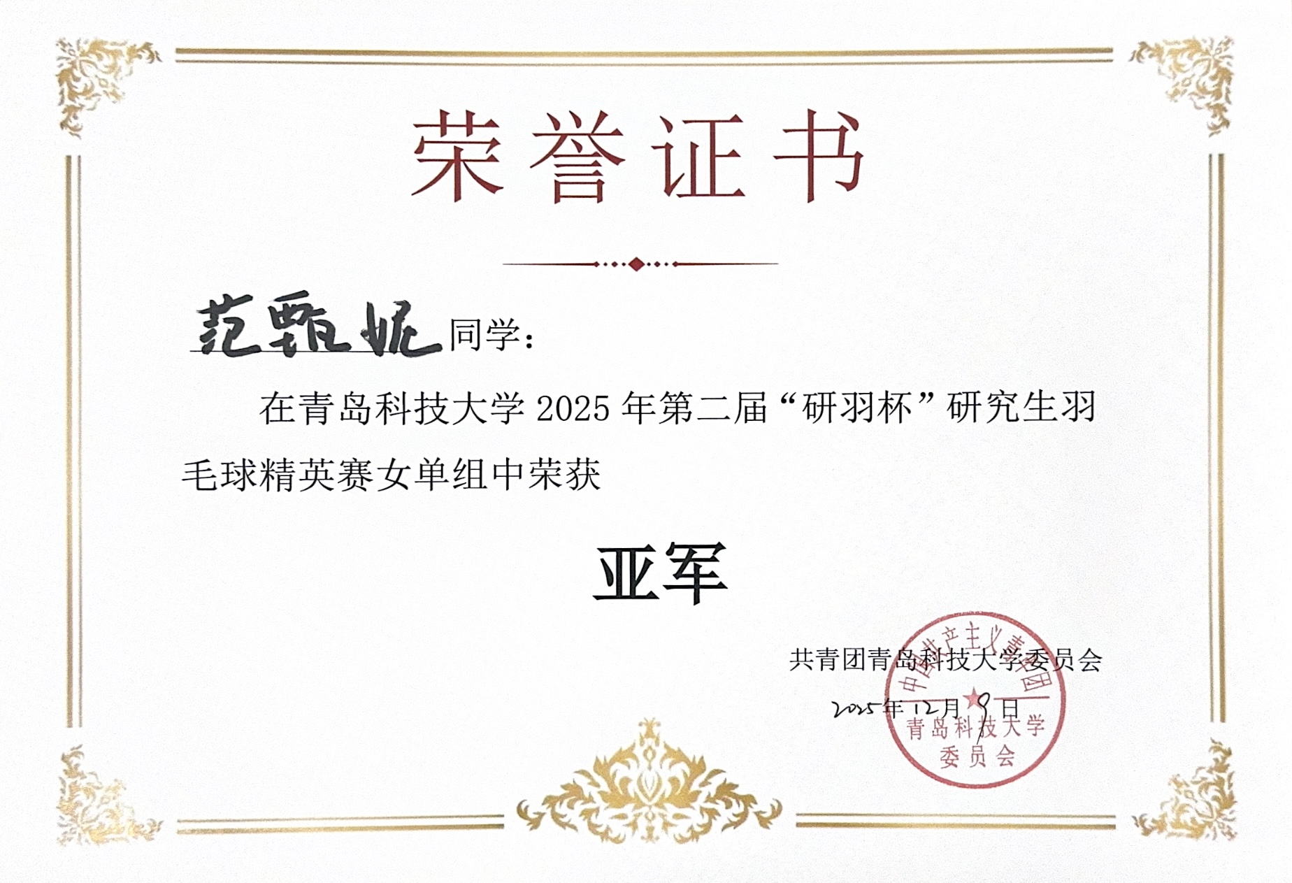 在2025年青岛科技大学第二届“研羽杯”研究生羽毛球精英赛中,我院2025级硕士研究生范甄妮同学顽强拼搏、发挥出色,荣获女子单打项目亚军,充分展现了我院学子昂扬向上的精神风貌与出色的个人竞技水平。