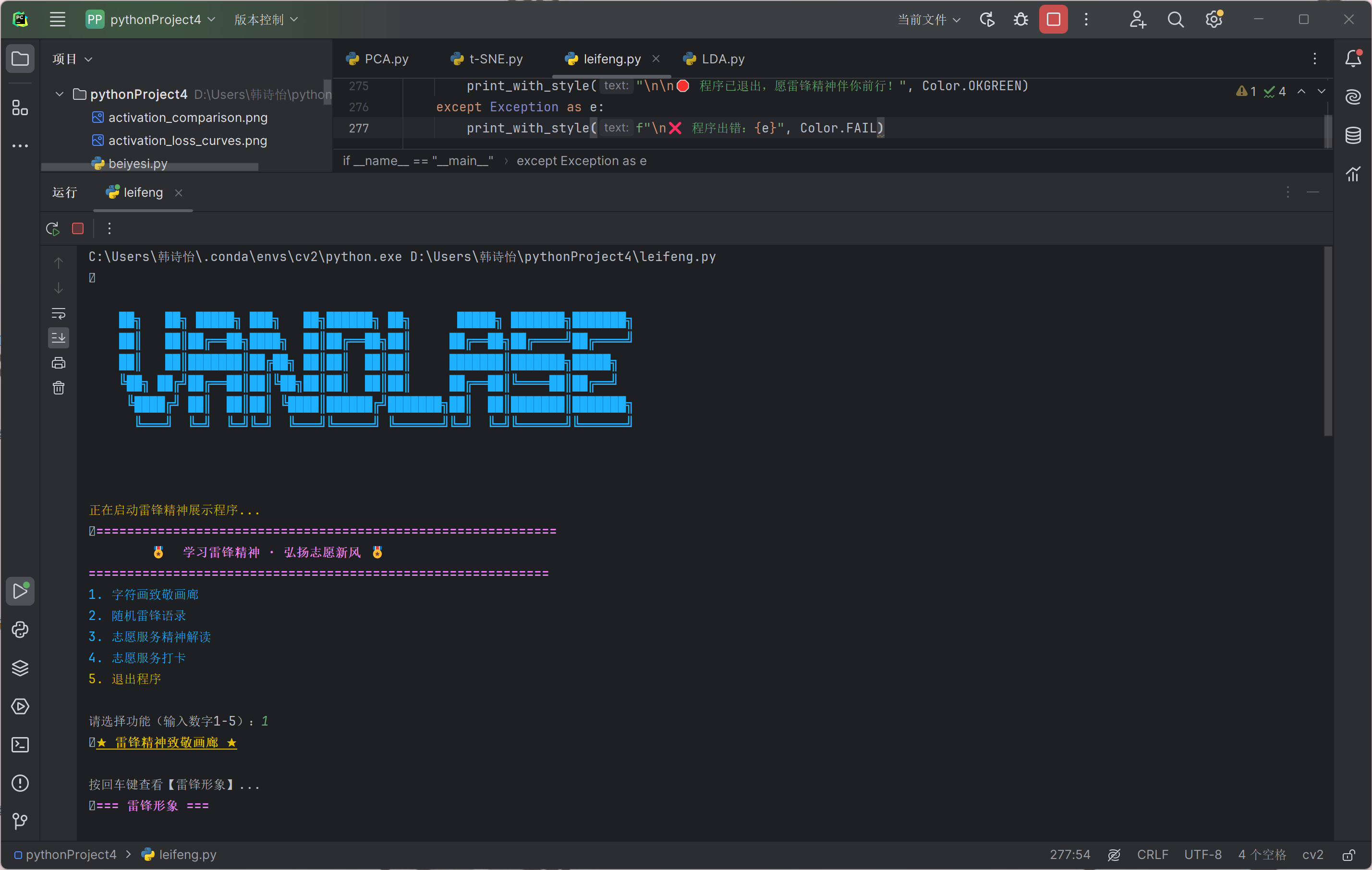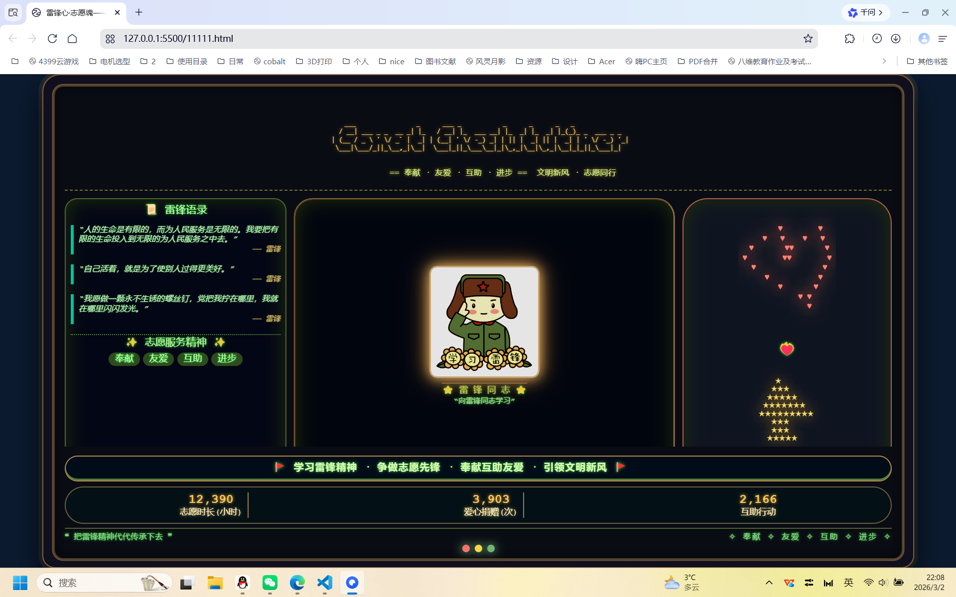 活动以来,数科学子积极响应学院号召,立足专业特色,将编程技能与雷锋精神深度融合,涌现出一批兼具思想性、创意性与专业性的优秀作品。学子们充分发挥专业优势,或通过代码精准呈现雷锋经典语录,传递精神力量;或用字符画精心勾勒雷锋形象、五角星等致敬元素,定格精神瞬间;或依托终端、网页交互效果,生动展现志愿服务的内涵与价值。这些作品以科技赋能精神传承,让雷锋精神在数字时代焕发新的生机,充分展现了数科学子扎实的专业素养、创新的思维能力和浓厚的志愿情怀。