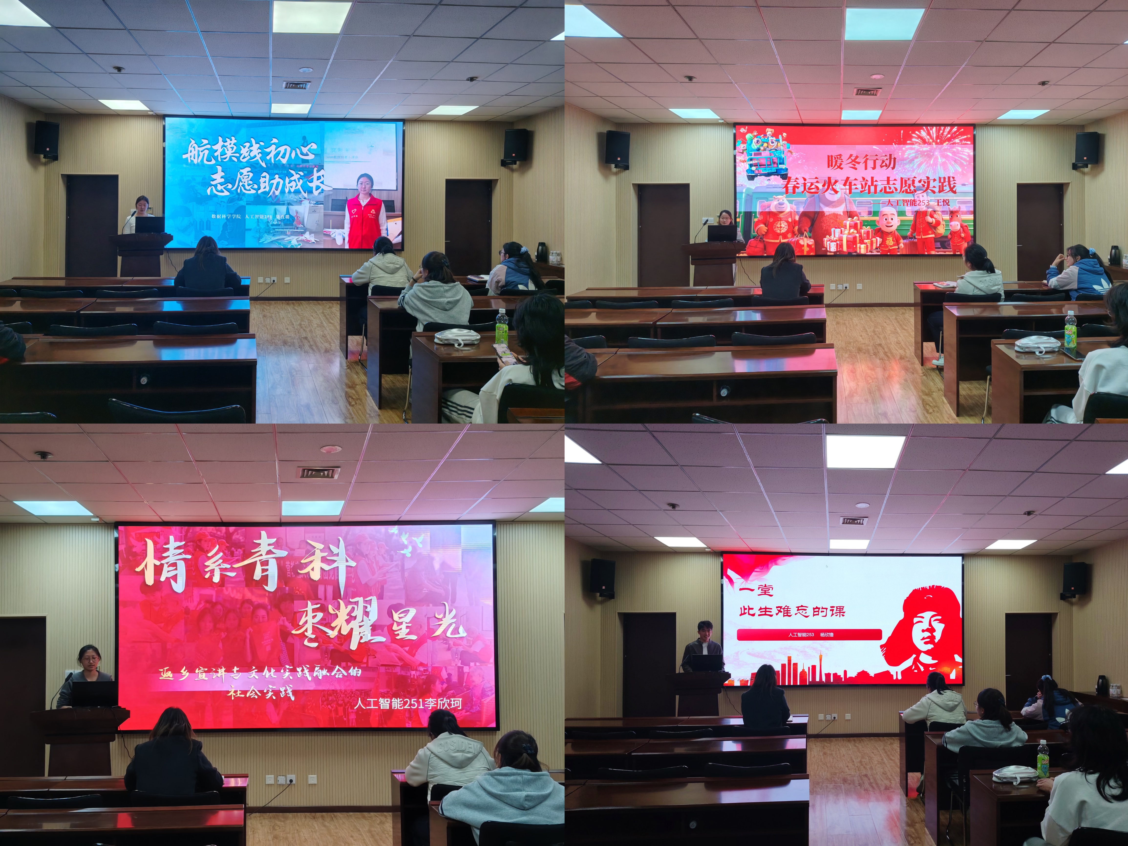 分享会上,同学们依次登台,结合PPT生动呈现了各自团队的实践历程与丰硕成果。有的同学积极投身基层服务,深入基层一线开展实践调研与志愿服务;有的同学参与暖冬关爱行动,为孤困儿童送去温暖与陪伴;还有的同学在春运期间前往火车站,协助开展引导咨询、秩序维护等志愿服务,用实际行动践行责任与担当。大家围绕实践中的挑战与突破、收获与成长展开交流,现场氛围热烈,掌声不断。通过分享,同学们不仅展现了扎实的专业能力,更传递出勇于实践、乐于奉献的青春风采。