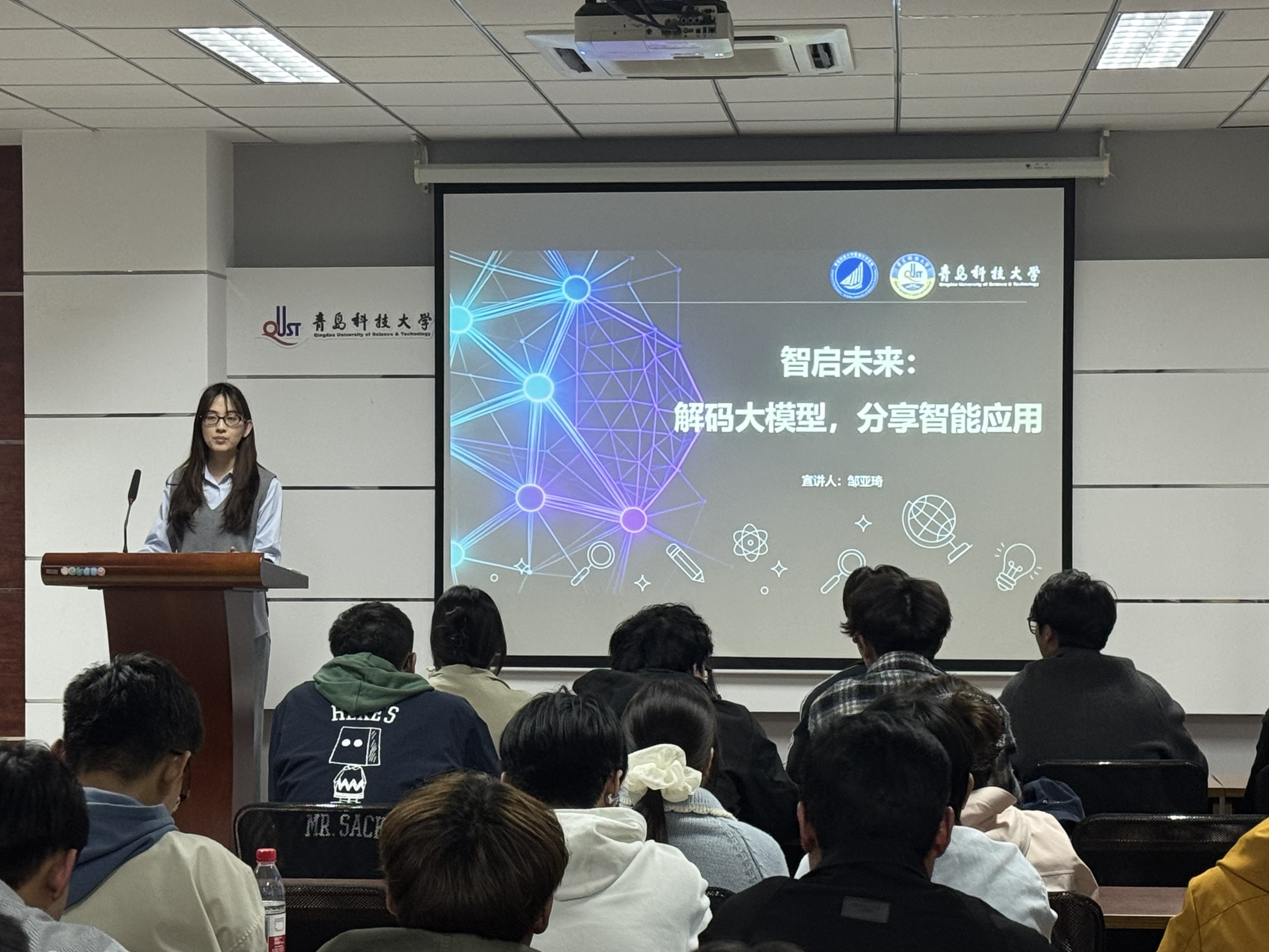 随后,数据科学学院研究生讲师团成员邹亚琦结合当前人工智能发展热点,从大模型基础认知、实用AI工具推荐以及AI幻觉防范等方面展开分享。介绍大模型的基本概念及ChatGPT、DeepSeek等典型大模型,围绕学习、写作等常见需求,推荐了秘塔、即梦、讯飞智文等实用工具,重点讲解AI幻觉的成因及应对方法,提醒同学们在使用AI生成内容时注重事实核查、资料约束和逻辑判断。