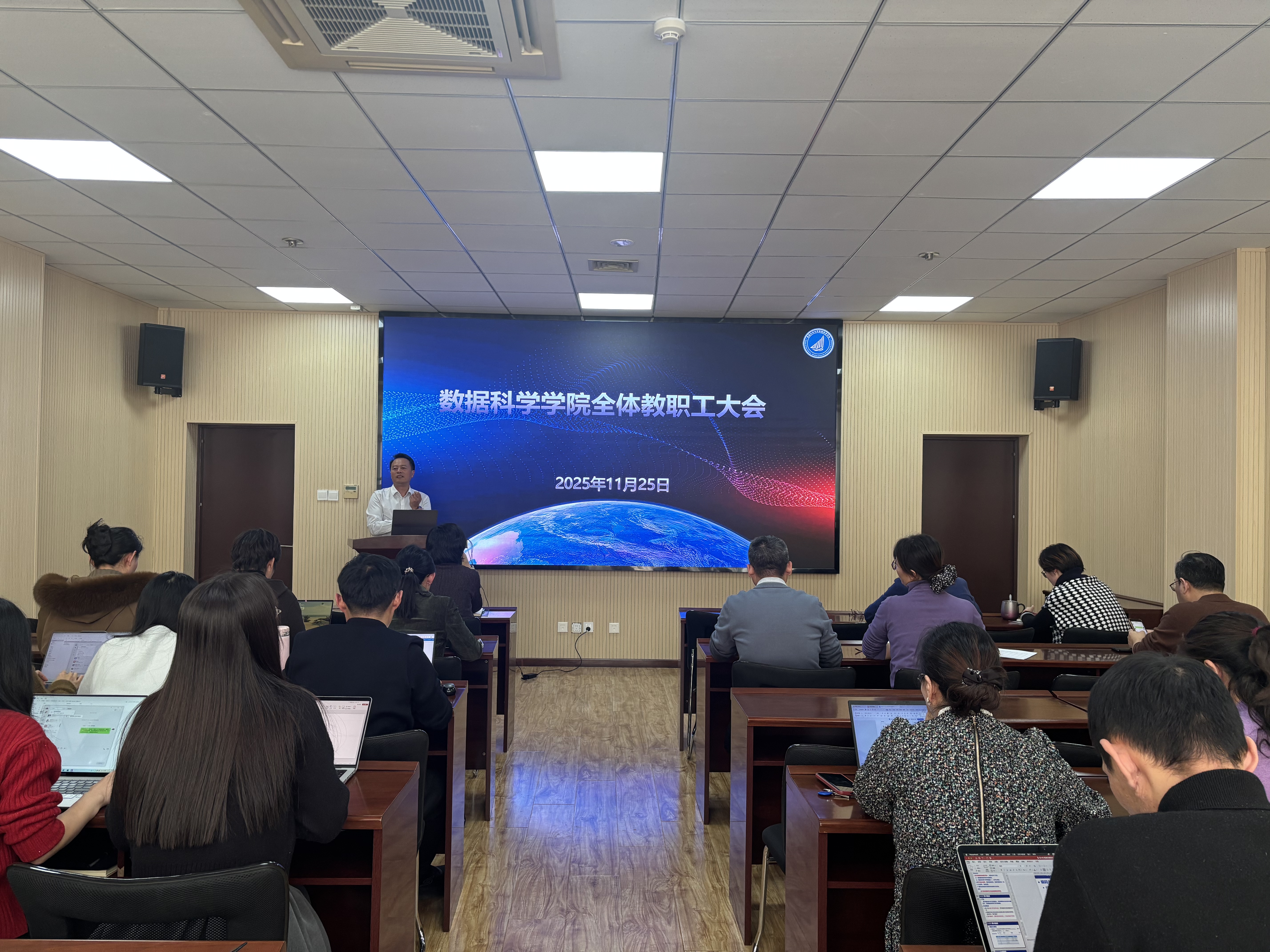 11月25日,数据科学学院召开全体教职工大会,专题学习党的二十届四中全会精神,并就贯彻落实全会精神、推动学院重点工作进行部署。学院常务副院长杜军威在会上作专题解读宣讲。