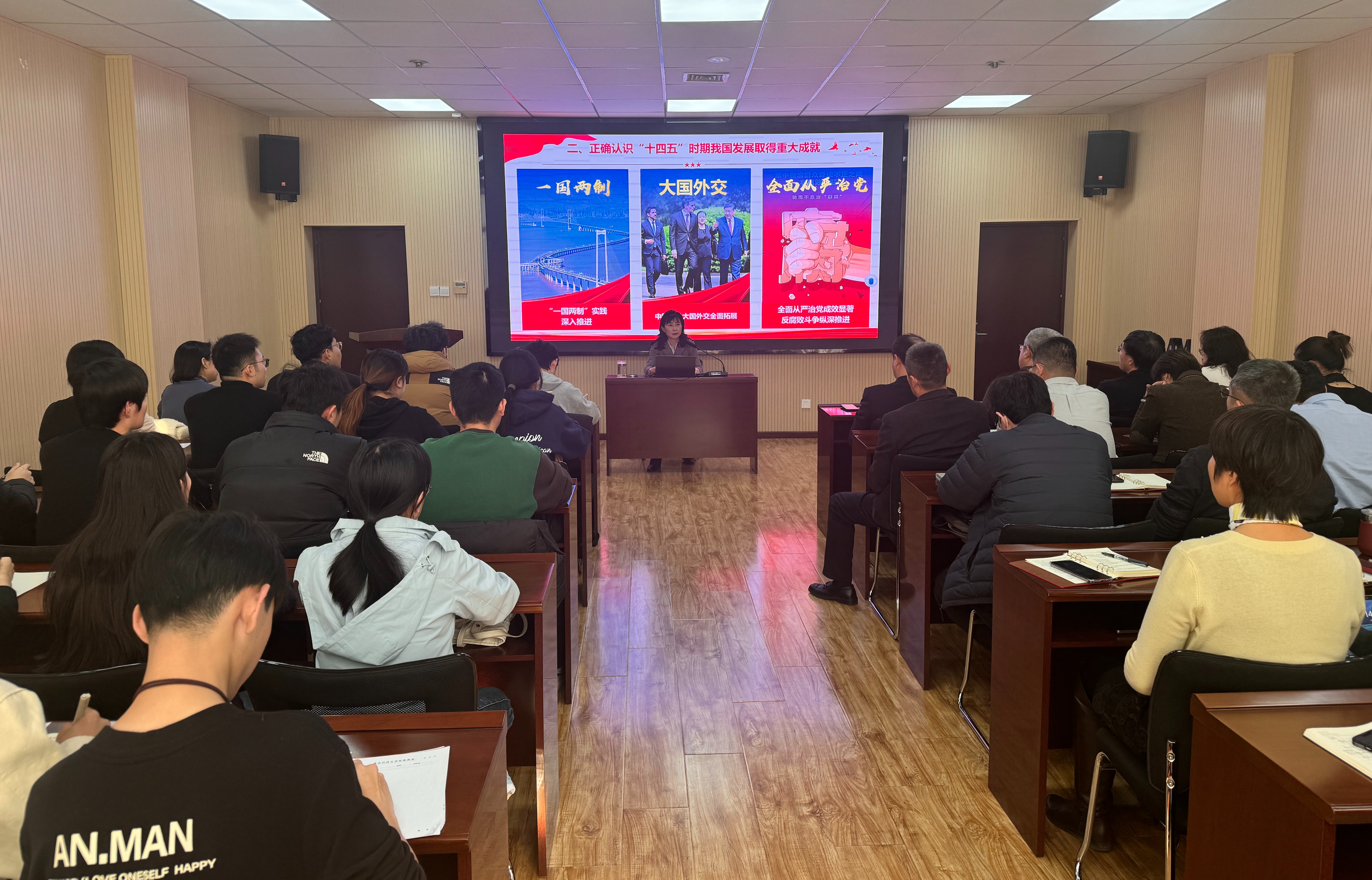 报告会上,沈文青围绕党的二十届四中全会的重大意义、核心成果与实践要求,结合学校“十五五”发展关键任务与学院学科特色,进行了系统深入、联系实际的阐释。她指出,全会是在中国式现代化建设进入关键阶段召开的一次具有全局性、历史性意义的重要会议,审议通过的《中共中央关于制定国民经济和社会发展第十五个五年规划的建议》,为我们把握新机遇、应对新挑战提供了方向指引和根本遵循。