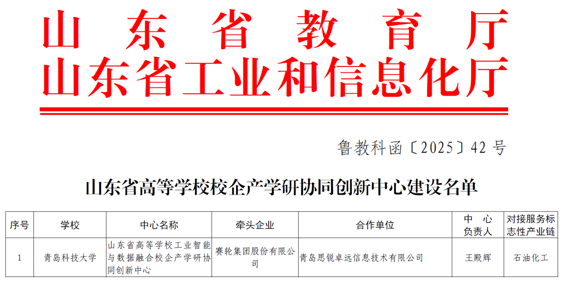 近日,山东省教育厅、山东省工业和信息化厅联合公布山东省高等学校校企产学研协同创新中心入选名单。数据科学学院与赛轮集团股份有限公司、青岛思锐卓远信息技术有限公司联合申报的山东省高等学校工业智能与数据融合校企产学研协同创新中心成功入选。